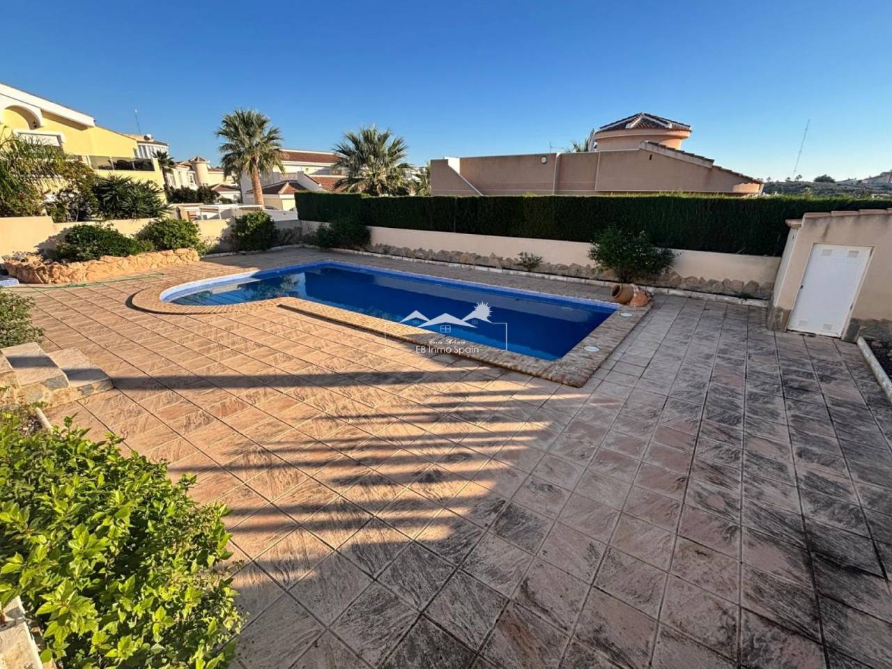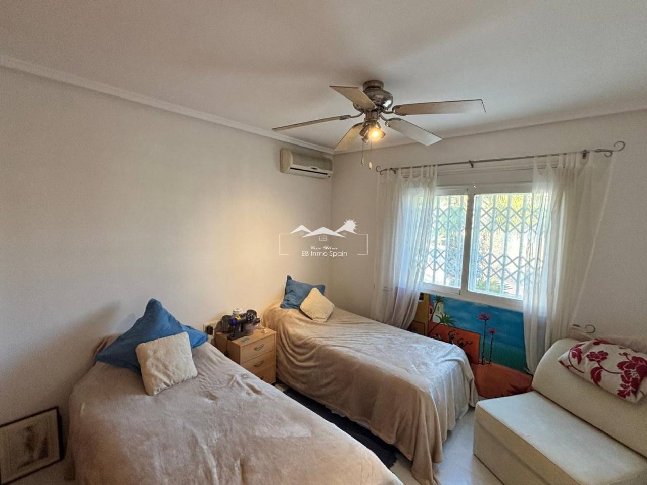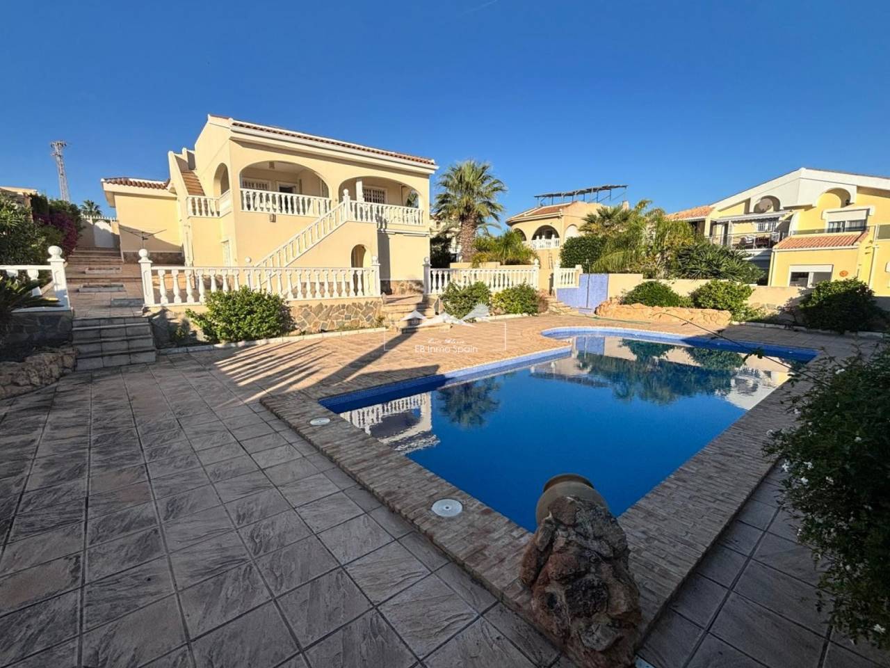 Here we have this amazing villa on the sought after area of La Fiesta. The property is set over 2 levels. Top level has 3 double bedrooms 2 bathrooms one being an en-suite, lounge and kitchen. There is a large covered terrace with views to the stunning swimming pool. Down stairs via a separate entrance is a self contained apartment with 2 double bedrooms bathroom separate lounge and kitchen. The property is set on a large plot with plenty of terraces and a large private pool. Complete with garage solarium with views to the lakes. Being offered mainly furnished.