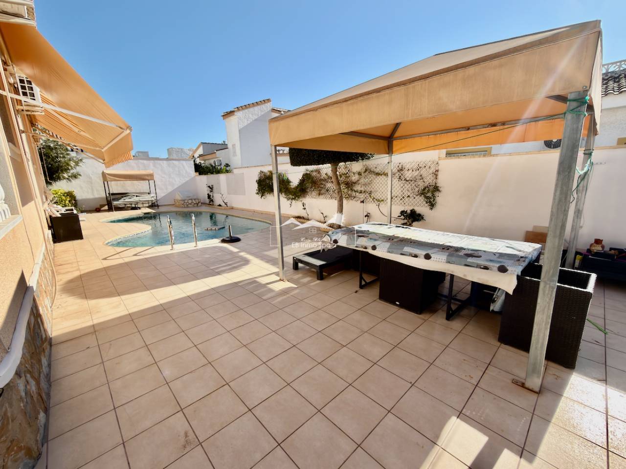 Elegant West-Facing Villa with Private Pool This well-presented three-bedroom villa is set on a generous 575 m² plot, offering privacy, comfort, and an ideal Mediterranean lifestyle. The property benefits from a desirable west-facing orientation, providing abundant natural light and beautiful afternoon and evening sunshine. The villa features a welcoming living area with a fireplace, complemented by air conditioning, ceiling fans, and gas central heating, ensuring year-round comfort. A separate fully fitted kitchen comes complete with white goods and is supported by a practical utility room for added convenience. There are three spacious bedrooms, all with fitted wardrobes, including a master bedroom with en-suite bathroom. A second family bathroom serves the remaining bedrooms. The layout is ideal for both permanent living and holiday use. Outdoor living is a key highlight, with a private swimming pool, attractive garden areas offering garden and pool views, and a glazed terrace perfect for relaxing or entertaining throughout the year. A solarium provides additional outdoor space for sunbathing and enjoying the surroundings. The property benefits from electric gates, a gated entrance, and off-road parking for two vehicles, ensuring both privacy and security. Furniture is negotiable, allowing for a smooth and flexible transition. Ideally located just 5 minutes from local amenities, 10 minutes from the beach and golf courses, and approximately 30 minutes from the airport, this villa offers an excellent opportunity as a permanent residence, holiday home, or investment property.