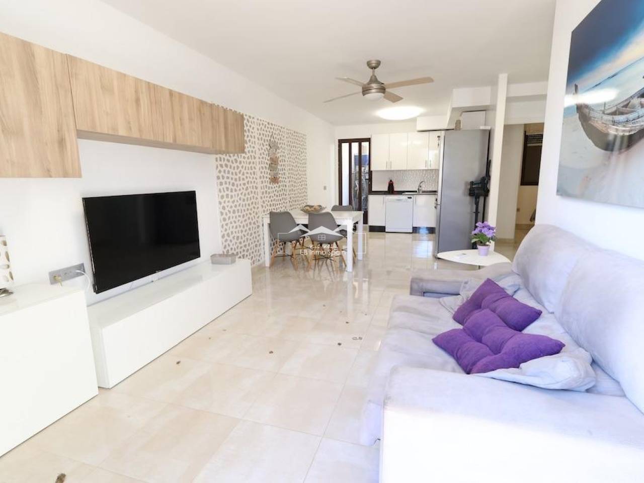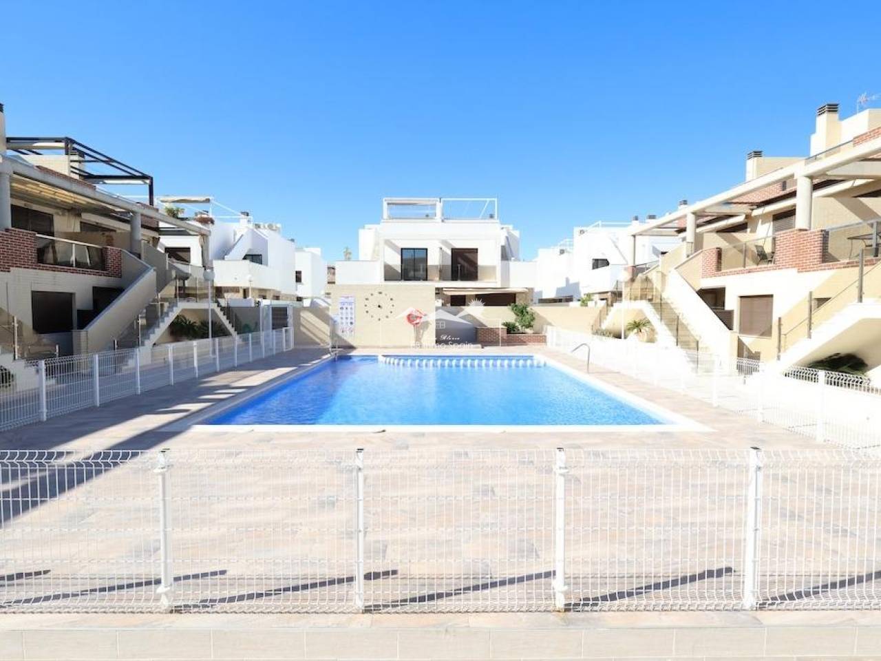 Lomas de Cabo Roig, Ground floor bungalow with a large tiled garden of about 30 m2, 64 m2 house with 2 bedrooms, 2 bathrooms, open kitchen to living room, back patio from which you can access the communal pool, the house is sold furnished and with air conditioning.