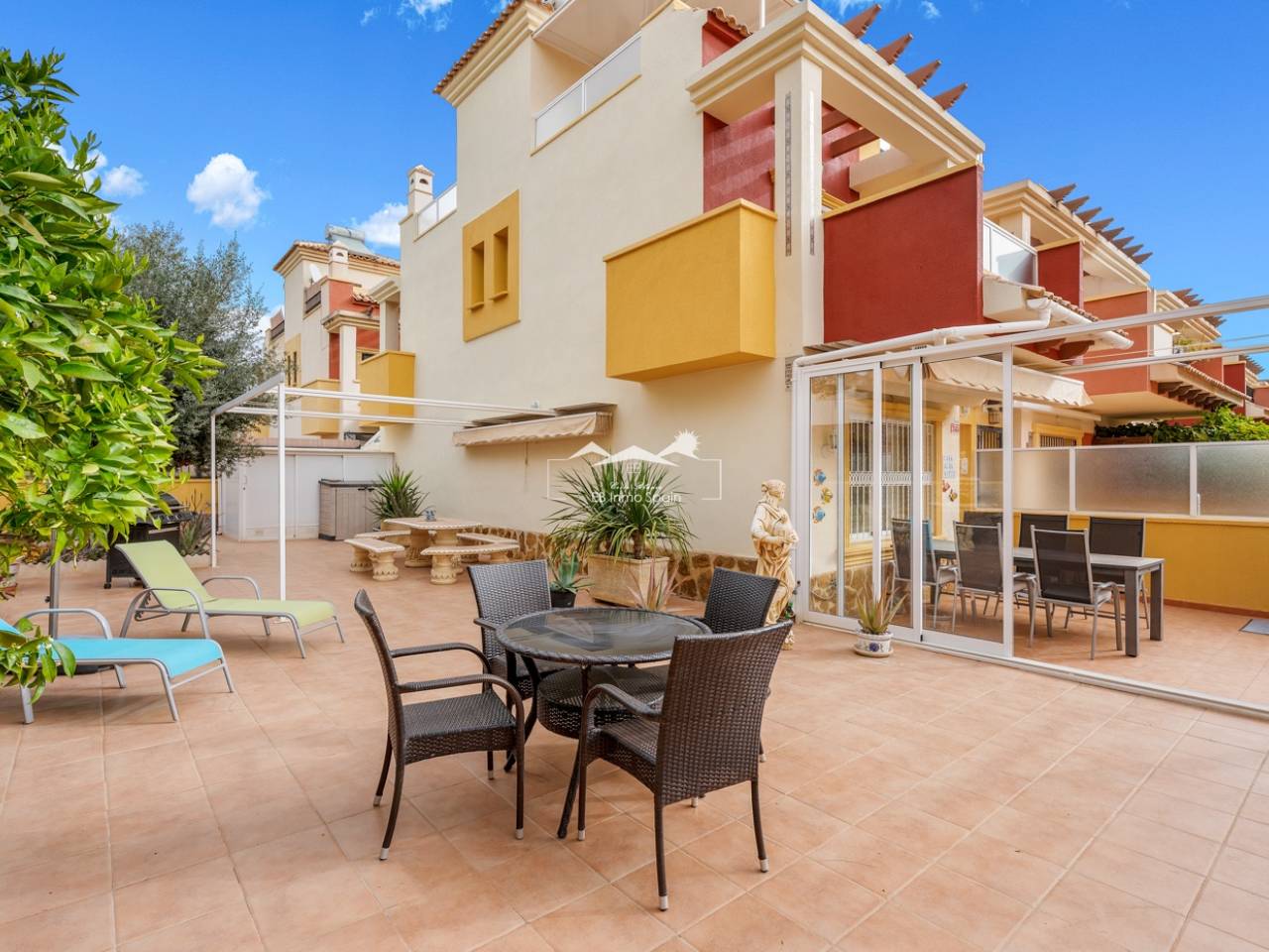 Located in the highly sought-after area of Villamartín on the beautiful Costa Blanca, this charming south-facing corner townhouse offers the perfect combination of space, privacy and Mediterranean lifestyle. The property sits on a large private corner plot of over 200 m², allowing plenty of outdoor space and sunshine throughout the day thanks to its excellent south orientation. Being a corner property also provides extra privacy, natural light and a more open feel compared to standard townhouses. The home is distributed over three levels: Ground floor: bright living and dining area, separate fully equipped kitchen, one bedroom and one bathroom — ideal for guests or convenient single-level living. First floor: two spacious bedrooms, both with their own private balconies, plus a second bathroom. Top floor: a private rooftop solarium, perfect for sunbathing, relaxing or creating a chill-out area with excellent privacy. The property is part of a gated residential community with access to a beautiful communal swimming pool, ideal for enjoying the warm Mediterranean climate. The location is another major highlight. The house is within easy reach of restaurants, bars, supermarkets and shops, and just a few minutes from the popular shopping destination La Zenia Boulevard — one of the largest shopping centres in the region Key Features Corner townhouse with large 200+ m² plotSouth-facing orientation (sun all day)3 bedrooms / 2 bathrooms1 bedroom on the ground floorSeparate fully equipped kitchen + closed patioPrivate balconies for both upstairs bedroomsPrivate rooftop solariumGated communityCommunal swimming poolPrime location in VillamartínMinutes from La Zenia Boulevard This property is perfect as a holiday home, permanent residence or rental investment, thanks to its prime location and excellent outdoor space.