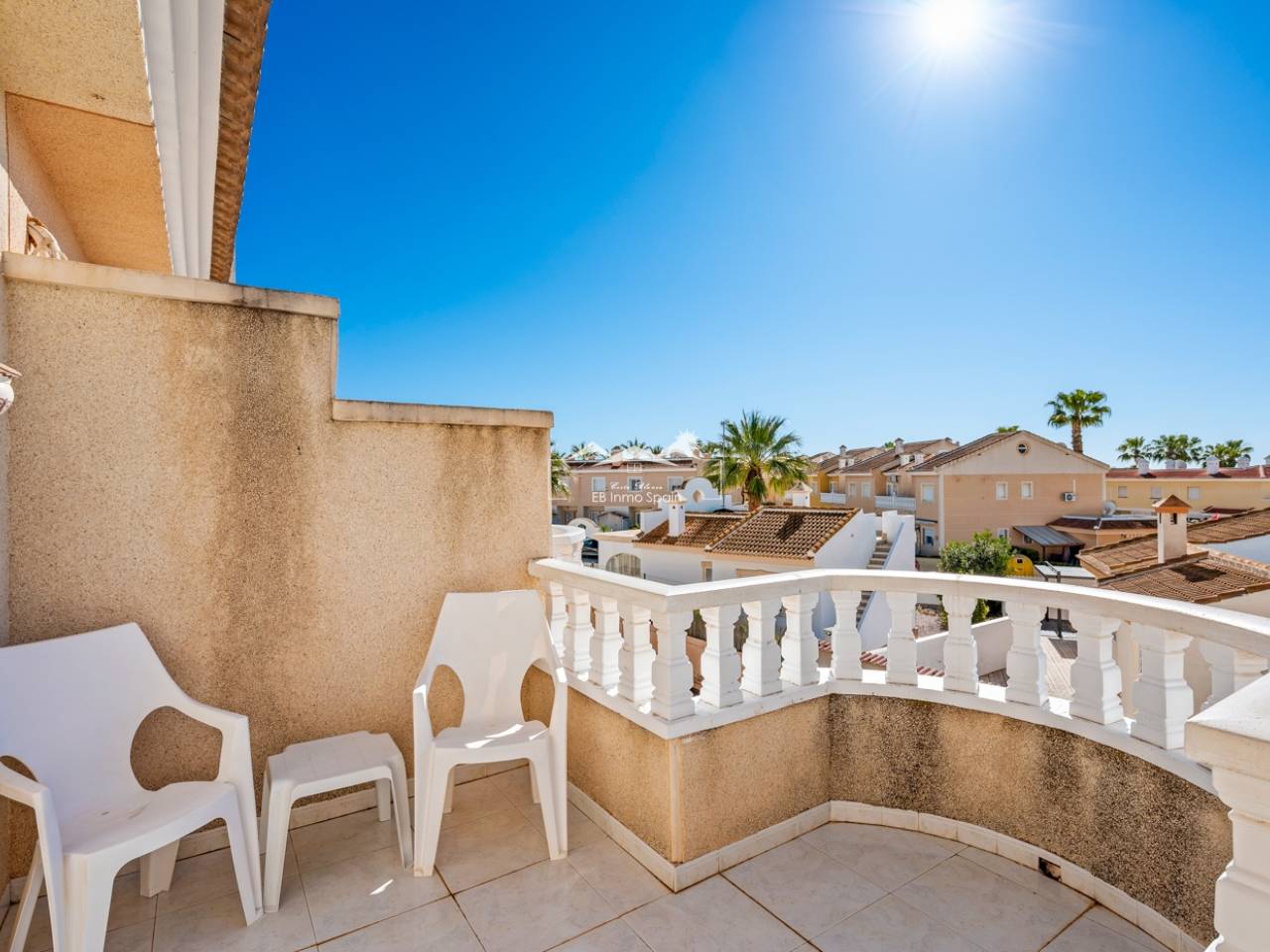 Discover this charming townhouse in the Las Palmeras residential complex, located in Ciudad Quesada, one of the most sought-after areas for its tranquility and proximity to all amenities. The property is distributed over two floors and features two fantastic terraces that allow you to enjoy the sun throughout the day: the front terrace receives the morning sun, perfect for starting your day outdoors, while the rear terrace offers afternoon sun, ideal for relaxing or enjoying gatherings with family and friends. On the main floor, you'll find a spacious and bright living room, a guest toilet, and a separate kitchen with direct access to the rear terrace, where there is also a large storage room with a laundry area. Upstairs, there are two bedrooms, the master bedroom being a highlight, with access to a lovely private terrace. The main bathroom is also located on this floor. The property is part of a well-maintained community with a communal swimming pool and an assigned parking space for each home. Its excellent location allows you to enjoy tranquility without sacrificing convenience: just 10 minutes from the beach and 5 minutes from supermarkets, restaurants, and all kinds of services. An ideal opportunity as either a permanent residence or a holiday home.