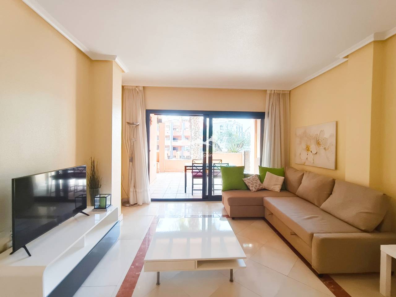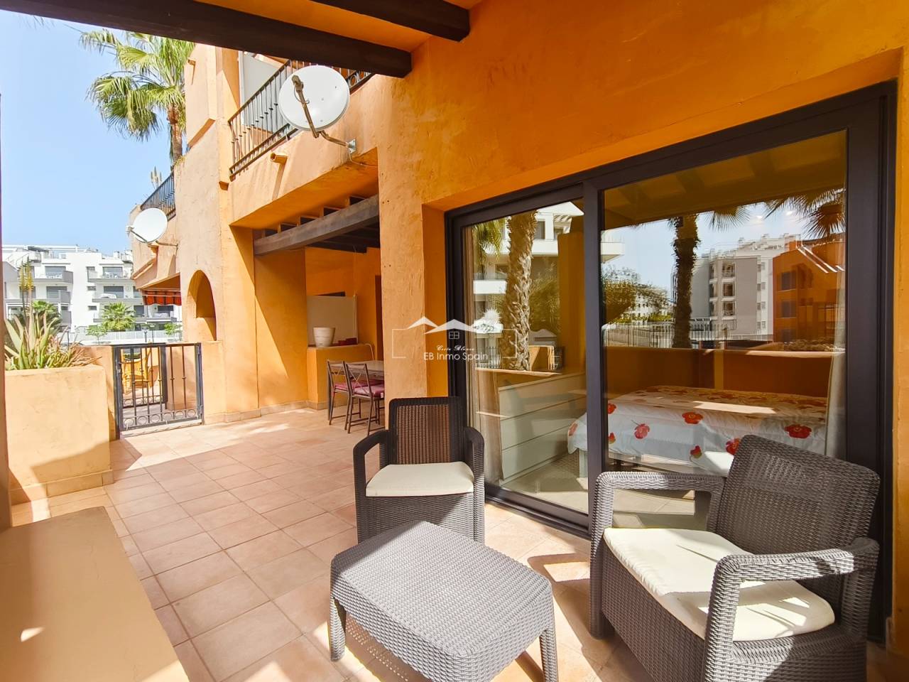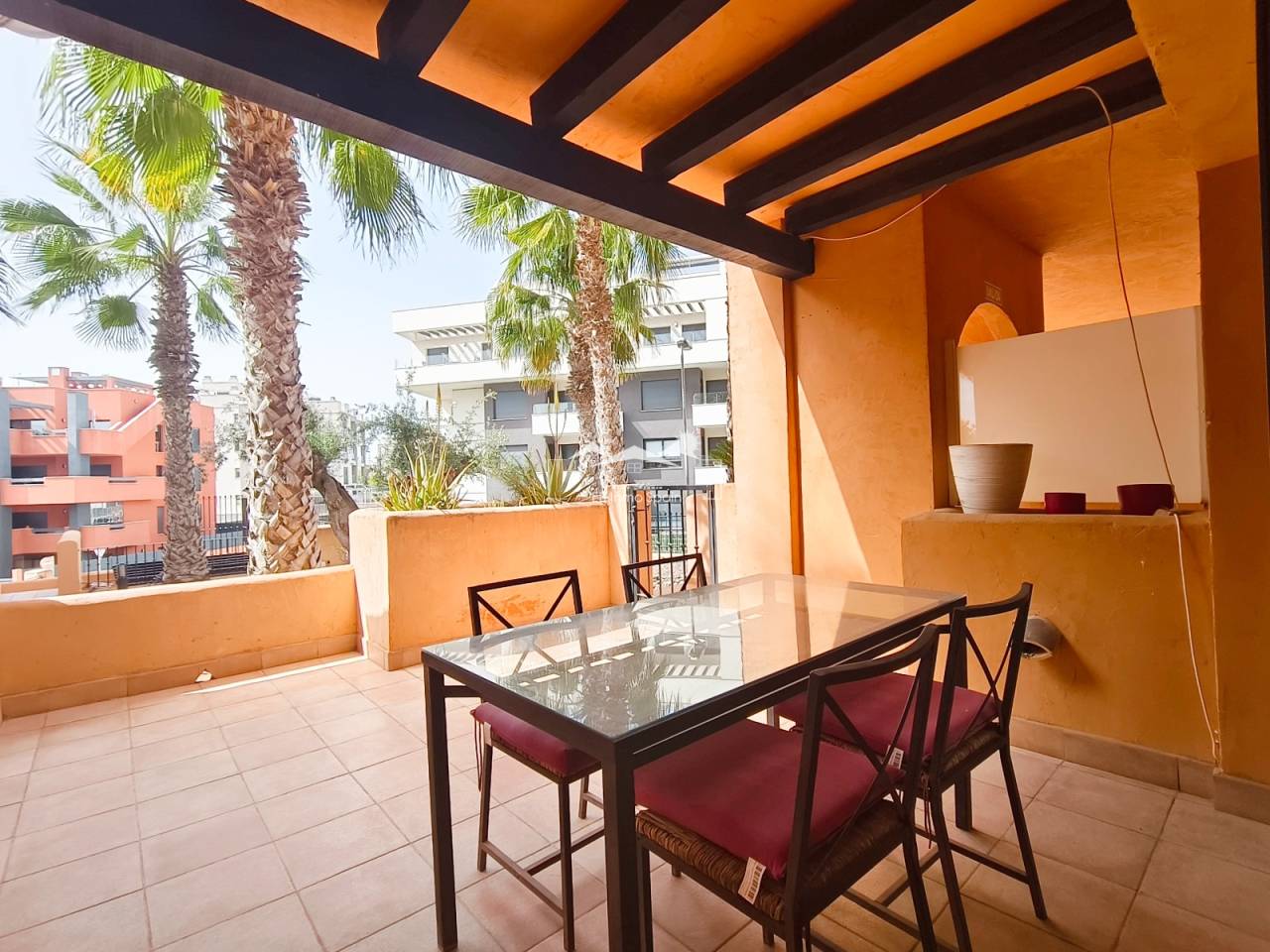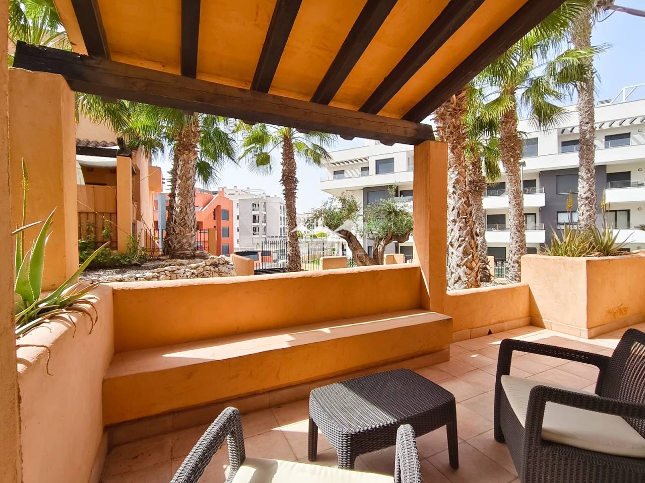 In Orihuela Costa, just a stone’s throw from Villamartín Golf Course, discover this south-facing ground-floor flat within a secure complex featuring a communal swimming pool. The flat, sold fully furnished, comprises two bedrooms, two bathrooms, central air conditioning, and two terraces, the main one of which faces south. The property also includes white goods, a parking space and a basement storage room. Don’t miss this rare opportunity, ideal as a main residence or a sunny holiday home. Contact us now for more information! Legal notice: The price shown does not include notary fees, registration fees, transfer tax (ITP) or any other costs associated with the sale. A breakdown of additional costs will be provided before you make a booking. The estate agent’s commission is INCLUDED IN THE PRICE.