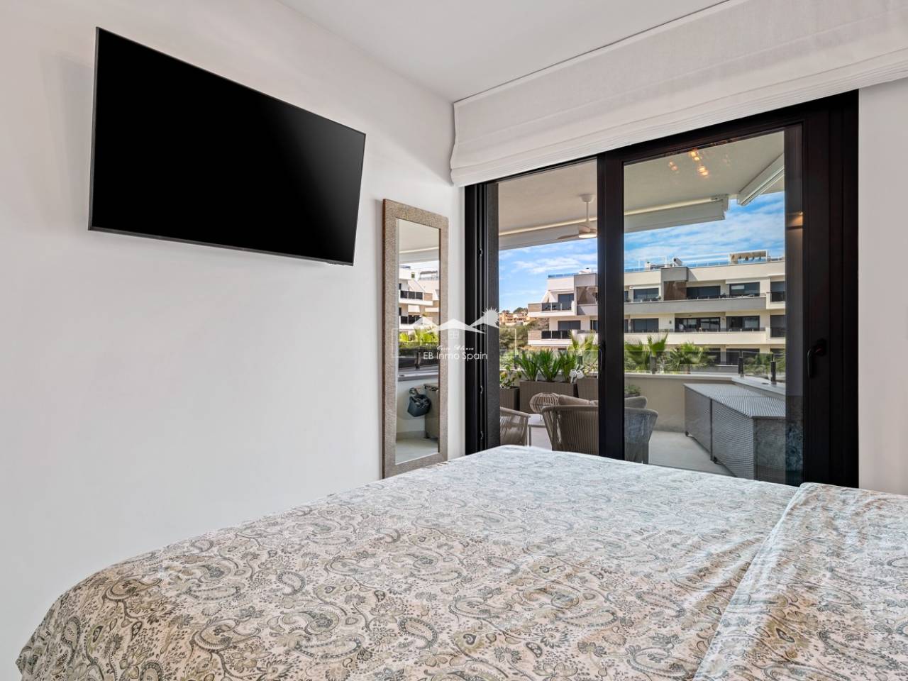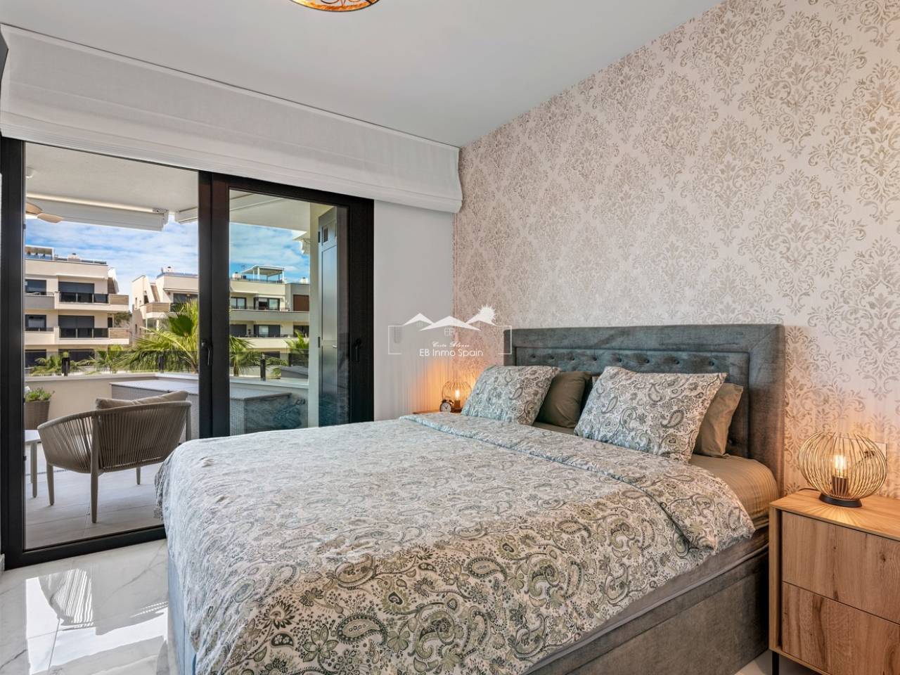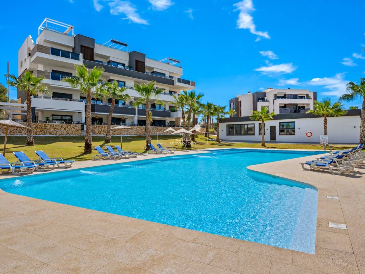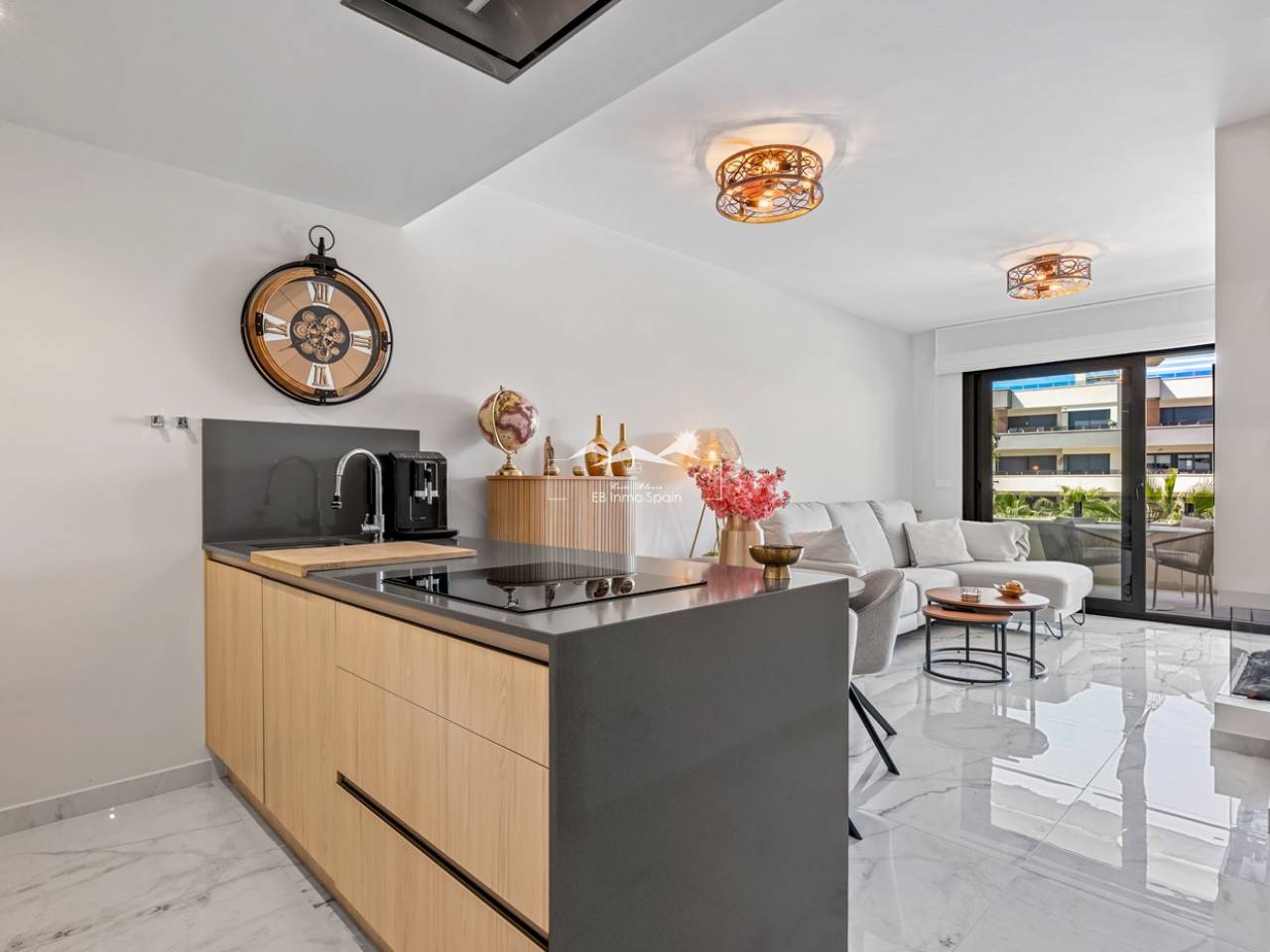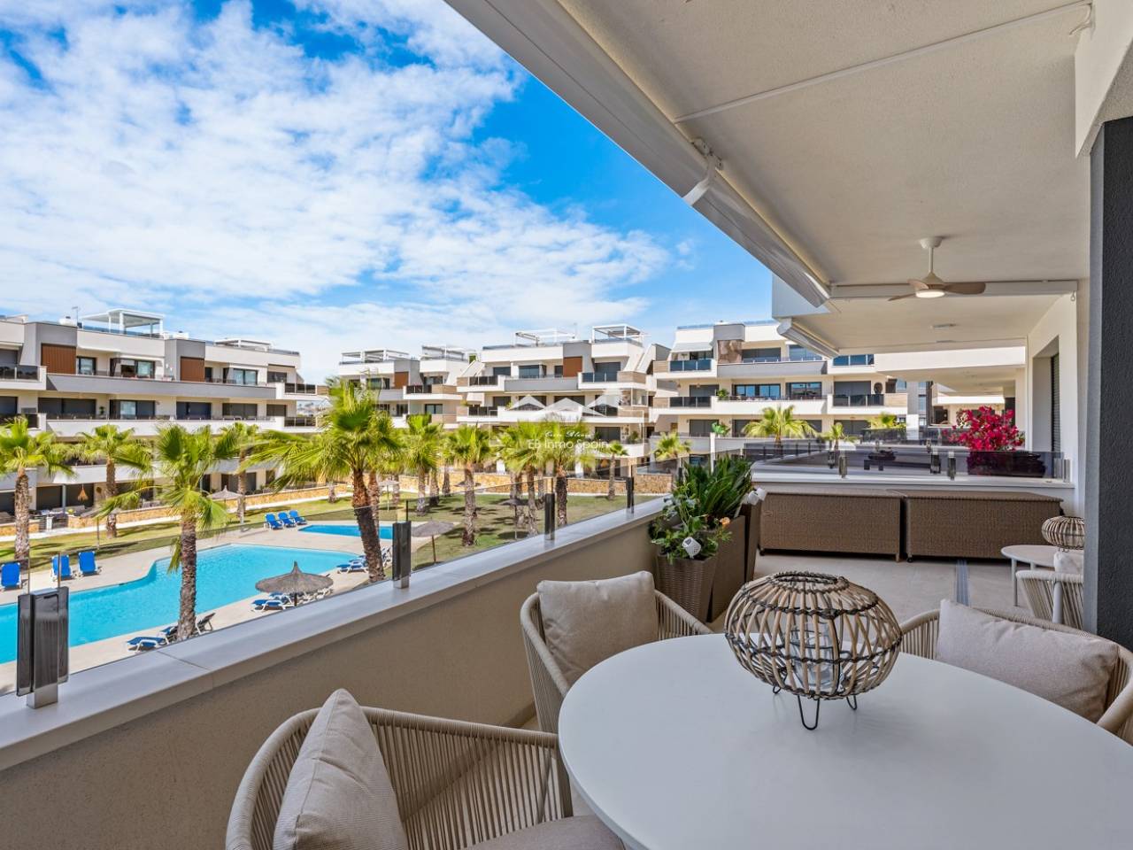 Luxury apartment in Resort Amanecer X, located in the popular area of Los Altos in Orihuela Costa. This stylish and contemporary apartment was completed in 2024 and represents an excellent opportunity as a holiday home, permanent residence, or investment with strong rental potential. The apartment features a bright, open-plan living room with kitchen and dining area, designed to maximize space and natural light. Large windows create an airy atmosphere and provide direct access to a spacious private terrace, seamlessly blending indoor and outdoor living. The kitchen is fully equipped with modern appliances and finished in a sleek, contemporary style that integrates perfectly with the living space. There are two spacious bedrooms, both with built-in wardrobes and located on the terrace side of the apartment, as well as two modern bathrooms finished to a high standard. The apartment is sold fully furnished and has a total surface area of 65 m², offering a practical and well-balanced layout. One of the standout features is the generous private terrace of over 25 m², overlooking the landscaped gardens and communal swimming pool. Thanks to its southwest orientation, the terrace enjoys excellent sun exposure, making it ideal for relaxing or outdoor dining. The apartment is located on the first floor of building number 8 with an elevator and includes an underground parking space and a private storage room. It is equipped with air conditioning, an Airzone climate control system, underfloor heating in the bathrooms, and electric shutters, ensuring year-round comfort. The property is in perfect condition, fully furnished, and ready to move in! Residents of Amanecer X enjoy a resort-style environment with access to a large communal swimming pool, a children’s pool, a fully equipped gym, as well as a jacuzzi and sauna. All of this is surrounded by beautifully maintained tropical gardens with adapted access for people with reduced mobility. The location is highly convenient: restaurants, cafés, and supermarkets are within walking distance, and La Zenia Boulevard is just a few minutes’ drive away. For golf enthusiasts, the area offers a wide selection of nearby courses, including Villamartín Golf just 5 minutes away, Real Club de Golf Campoamor and Las Ramblas Golf within approximately 10 minutes, and the prestigious Las Colinas Golf & Country Club about 15 minutes from the apartment. The sandy beaches of Orihuela Costa, such as La Zenia Beach, Playa Flamenca, Cabo Roig, and Campoamor, are all within a 10-minute drive. The apartment is ideally located between two major airports, offering excellent connections: Alicante Airport is approximately 45 minutes away, and Murcia International Airport is around 35 to 40 minutes by car.