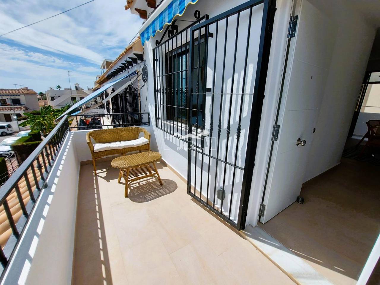 Oportunidad de inversión o segunda residencia: A tan solo 400m del mar y con vistas frontales espectaculares. Bungalow de planta alta, precioso, reformado y con licencia turística. 2 dormitorios dobles, 1 con baño en-suite y 1 baño completo aparte. Zona de salón-comedor y cocina abierta. En la planta de arriba, tiene una fantástica terraza de unos 50m con barbacoa, fregadero y espacio de almacenaje. Situado en una urbanización cerrada con piscina comunitaria y un espacio de parking. Es una urbanización pequeña y tranquila. A tan solo unos minutos caminando del mar y a menos de 5 minutos en coche de las Playas de Torrevieja y La Mata. Cercano a supermercados, bares, restaurantes y otros servicios.