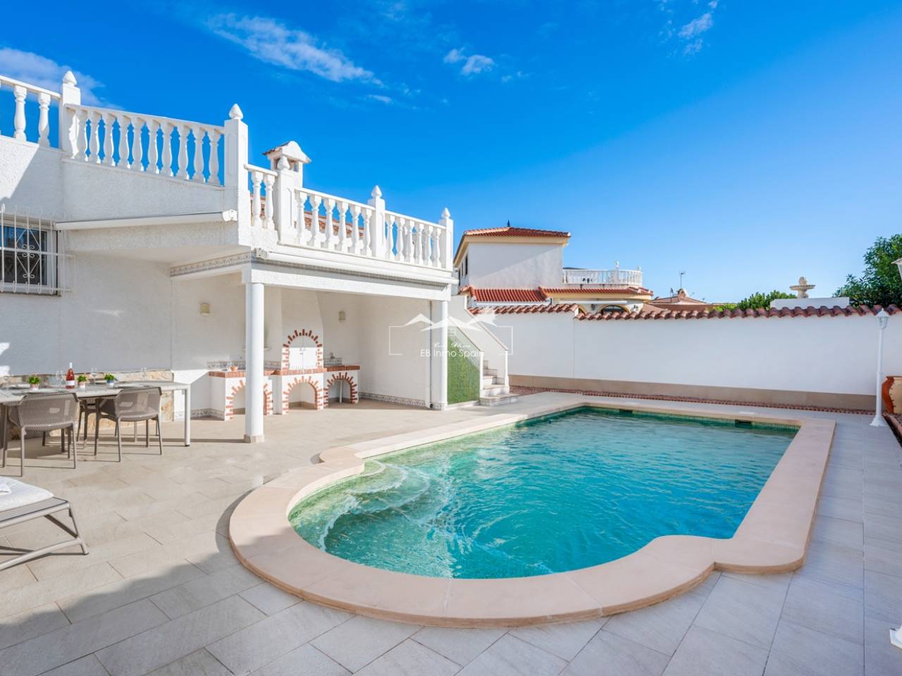 Esta hermosa villa independiente se encuentra en Ciudad Quesada, a solo 5 minutos a pie del centro, ofreciendo comodidad y privacidad. La propiedad se asienta sobre una generosa parcela de 500 m² y cuenta con 146 m² de superficie construida. La casa se distribuye en tres amplios dormitorios y dos baños, el principal con baño en suite. La villa cuenta con un amplio y luminoso salón-comedor con abundante luz natural, creando un ambiente cálido y acogedor. La cocina independiente tiene acceso directo a la parte trasera de la propiedad, donde encontrará una piscina privada, una cocina exterior y acceso al solárium, perfecto para disfrutar del estilo de vida mediterráneo. Desde el lateral de la cocina, también se accede directamente al garaje interior y a un versátil espacio debajo del garaje. Esta zona es ideal para usarse como dormitorio adicional, zona social o de ocio, o como un acogedor estudio/oficina. El exterior rodea toda la casa y cuenta con árboles frutales, proporcionando un ambiente agradable y privado. La propiedad ha sido recientemente renovada y se presenta en perfecto estado, lista para entrar a vivir. Esta propiedad es una excelente oportunidad tanto para vivienda permanente como para inversión en una de las zonas más cotizadas de Ciudad Quesada.