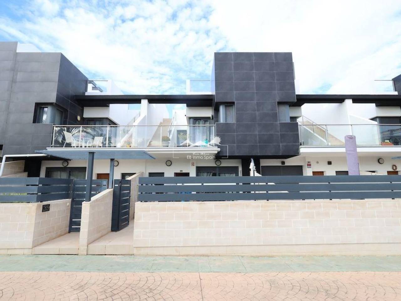 Playa Flamenca, Residencial El manantial adosado con orientación sur de dos plantas más sótano destinado a garaje de 101 m2 y 97 m2 de garaje, la vivienda cuenta con 3 dormitorios (1 de ellos en planta baja) y 3 baños, salón comedor, cocina abierta al salóncon patio trasero, amplio jardin delantero frente a la zona comunitaria y un amplio solarium con vistas a las zonas comunes y a las 2 piscinas comunitarias y zona de juegos para niños.