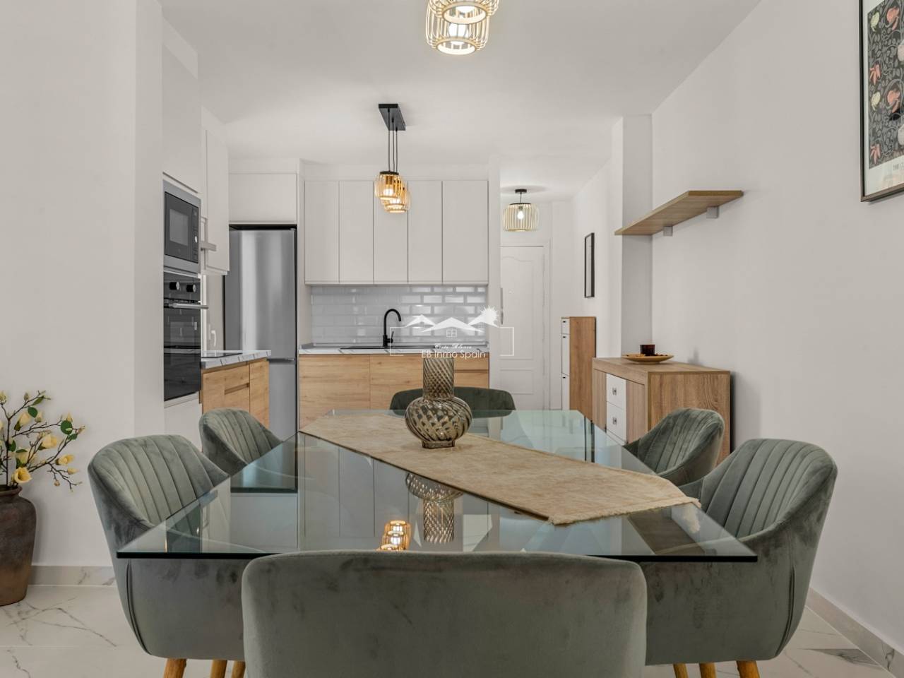 Magnificent 75 m² apartment, completely renovated and ready to move into. The property features three spacious bedrooms, one of which is en suite, and an additional bathroom, both equipped with showers. It has a modern, fully equipped kitchen with access to a convenient interior patio where the laundry area is located. The living-dining room flows seamlessly into the kitchen, creating a bright and airy open-plan space, ideal for enjoying time with family and friends. All rooms are equipped with ceiling fans and air conditioning, ensuring year-round comfort. The apartment offers partial sea views and enjoys a prime location in Playa del Cura (Torrevieja), just steps from the beach and the promenade, surrounded by leisure areas, restaurants, and all amenities. It is being sold fully furnished and includes a parking space.