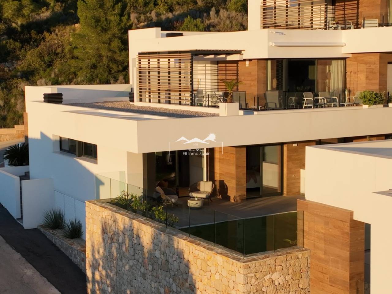 Apartamentos en Cumbre del Sol: belleza natural junto al mar. Cada apartamento de Montecala Gardens es único, su distribución, espacios exteriores y terrazas van variando en función de su ubicación. Greco 27-Impresionante ático con una preciosa vista que combina mar y la preciosa vista a la zona verde del Portet de Moraira. El interior está distribuido en tres dormitorios dobles con armarios roperos, dos baños, cocina abierta al salón comedor, lavadero y la joya de este ático, una terraza de 56m2 con una zona destinada a comedor, cubierta con una pérgola de madera y bancada preparada para instalar una barbacoa. Cada apartamento está equipado con suelo radiante, climatización por aerotermia de alta eficiencia. La cocina, completamente equipada con electrodomésticos de alta gama, y una mesa de diseño integrada en el estilo de la cocina y el salón, a juego con los distintos elementos decorativos. Los baños también están totalmente terminados, con mampara, espejo, muebles con cajoneras, todo listo para entrar a vivir. Además, todos los apartamentos incluyen plaza de aparcadero y trastero, así como acceso a las zonas comunes del complejo, con varias piscinas, grandes terrazas, zona de juegos infantil, además de todos los servicios de Cumbre del Sol.
