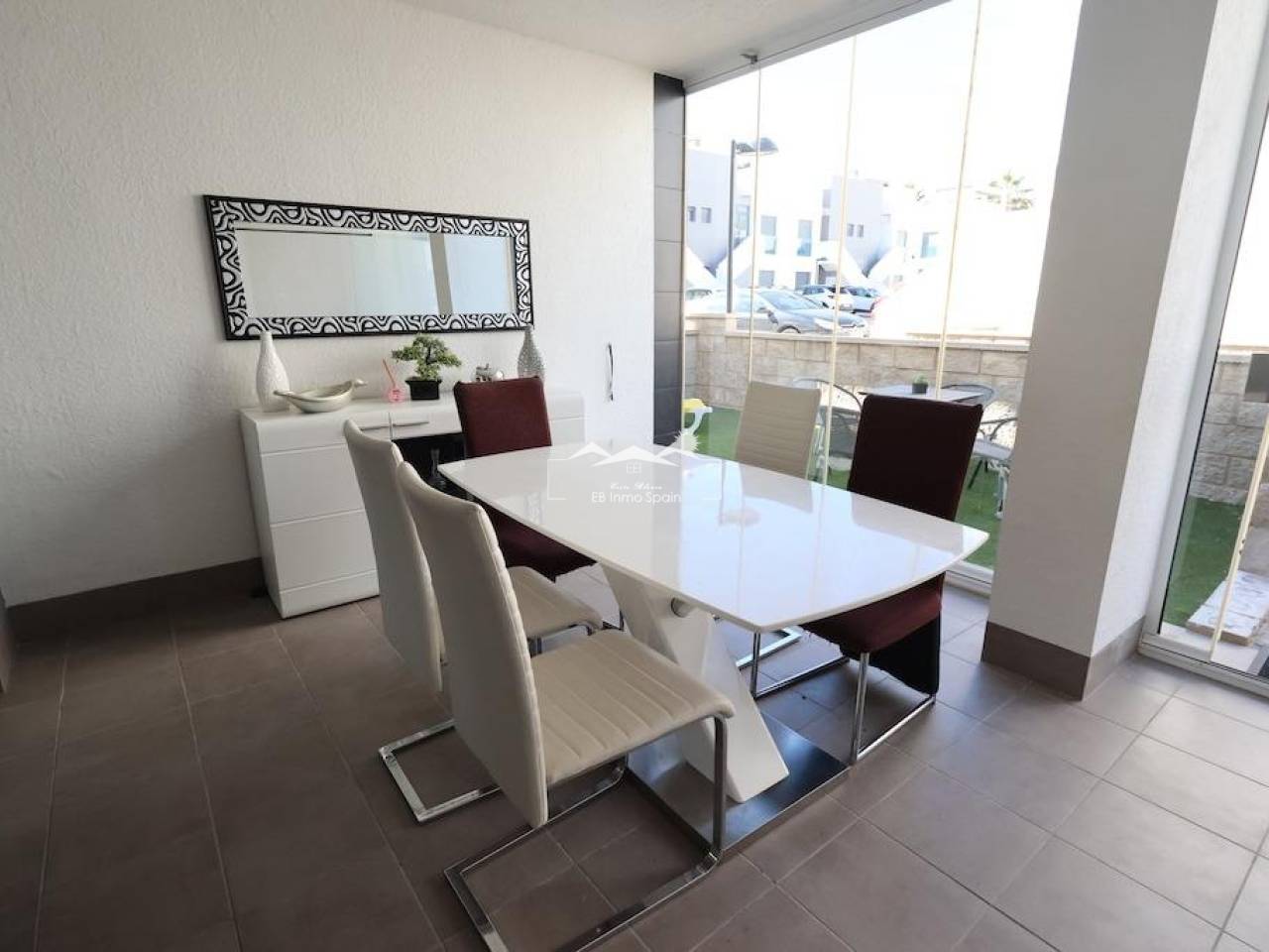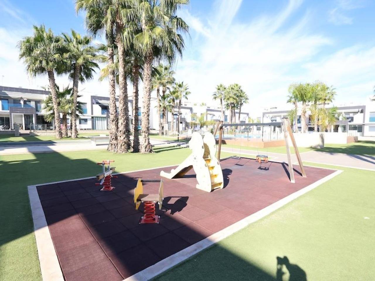 Bungalow en planta baja con dos jardines: uno de 13 m² con acceso directo a la zona de la piscina comunitaria, y otro de 6 m² en la parte trasera de la vivienda. . La propiedad cuenta con 77 m² distribuidos en 2 dormitorios, 2 baños, cocina americana abierta al salón-comedor y una terraza acristalada. . . Se vende amueblada y equipada con aire acondicionado. Incluye plaza de aparcamiento exterior. . El residencial ofrece amplias zonas verdes, área infantil y está ubicado junto al centro comercial Zenia Boulevard..
