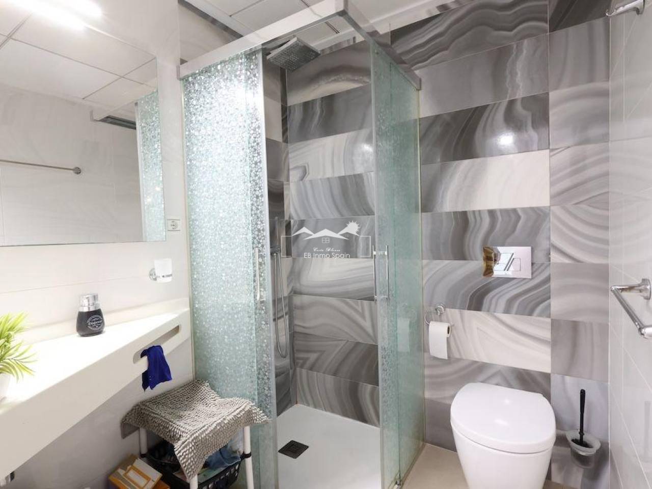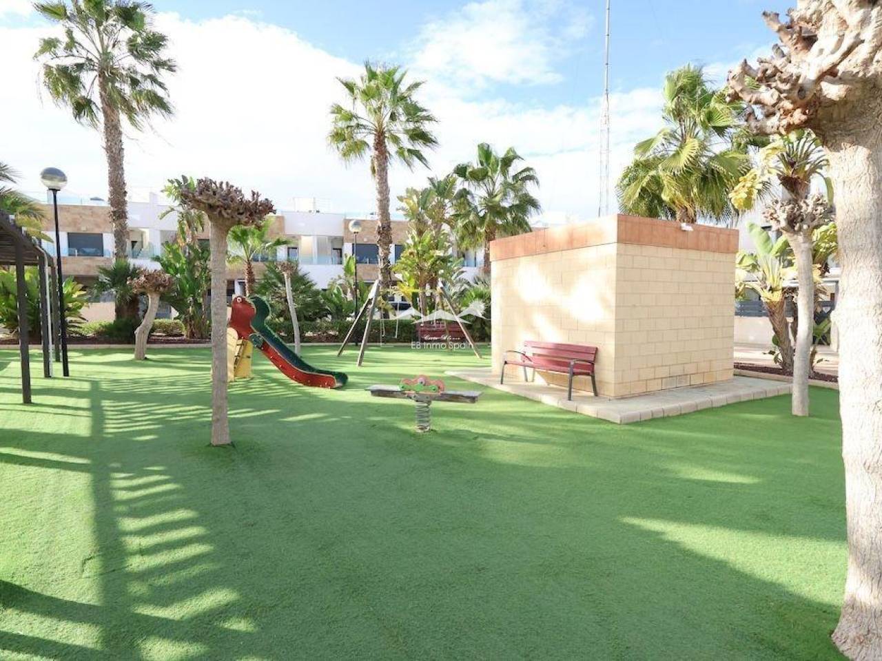 Playa Flamenca, Residencial El manantial adosado con orientación sur de dos plantas más sótano destinado a garaje de 101 m2 y 97 m2 de garaje, la vivienda cuenta con 3 dormitorios (1 de ellos en planta baja) y 3 baños, salón comedor, cocina abierta al salóncon patio trasero, amplio jardin delantero frente a la zona comunitaria y un amplio solarium con vistas a las zonas comunes y a las 2 piscinas comunitarias y zona de juegos para niños.