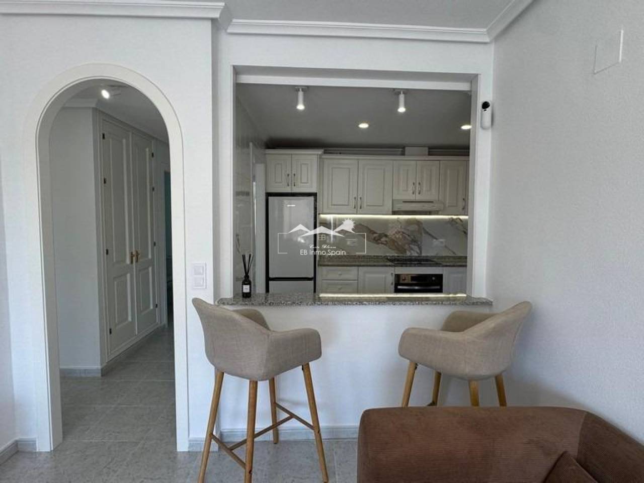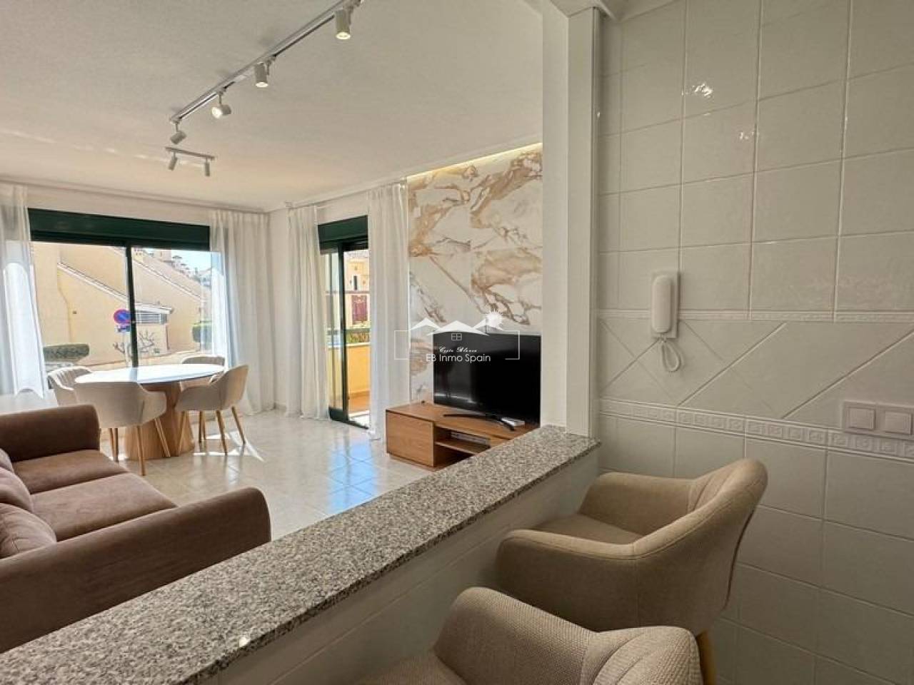 Este excepcional apartamento ubicado en la prestigiosa zona de Lomas de Campoamor ofrece un estilo contemporáneo y comodidad inigualable. Con una superficie construida de 83 m2, esta unidad situada en planta baja elevada cuenta con orientación sur, garantizando vistas despejadas que iluminarán su hogar durante todo el día. La propiedad ha sido completamente reformada e incluye dos amplios dormitorios y dos baños equipados, uno de ellos con ducha a ras del suelo para mayor confort. Su interior destaca por mobiliario de diseño moderno y materiales como piedra natural y baldosas porcelánicas grandes que aportan elegancia al espacio. Aire acondicionado inverter, instalado en todas las estancias, calefacción central a gas así como caldera doble asegurando bienestar climático tanto frío como calor. Aproveche las instalaciones comunitarias que incluyen una piscina bien mantenida rodeada por zonas verdes ajardinadas; además está estratégicamente localizado cerca campos golfísticos. Sin patios interiores ni ruidos molestos gracias a su buen aislamiento acústico. Hogar ideal preparado para disfrutarlo desde el primer momento.. . El precio de venta no incluye el impuesto (ITP- tipo vigente según comunidad autónoma)